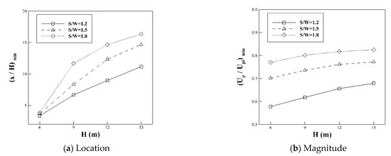 By examining the magnitudes of the maximum pedestrian wind speeds at different tree heights and spaces, Figure 15 shows that the magnitude of the local wind speed maxima appears insensitive to the change of the tree distance when H = 6 m. When the trees are taller, however, the value of the maximum wind speed becomes greater as the tree height increases or the tree space decreases. On the other hand, Figure 16 illustrates the locations and magnitudes of the downstream minimum pedestrian wind speeds. In the cases of 6 m tree height, the location of minimum wind speed appears nearly independent of the tree space. When the tree becomes taller, the minimum value occurs further downstream with increases of the tree height and tree space. Meanwhile, the magnitude of the minimum wind speed generally increases as the tree height increases or the tree space increases.