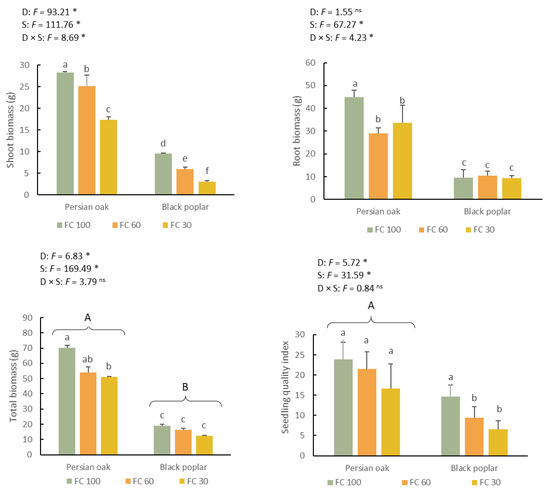 - Jafarnia, S.; Akbarinia, M.; Hosseinpour, B.; Modarres Sanavi, S.A.; Salami, S.A. Effect of Drought Stress on Some Growth, Morphological, Physiological, and Biochemical Parameters of Two Different Populations of Quercus brantii. iForest 2018, 11, 212–220. [Google Scholar] [CrossRef]