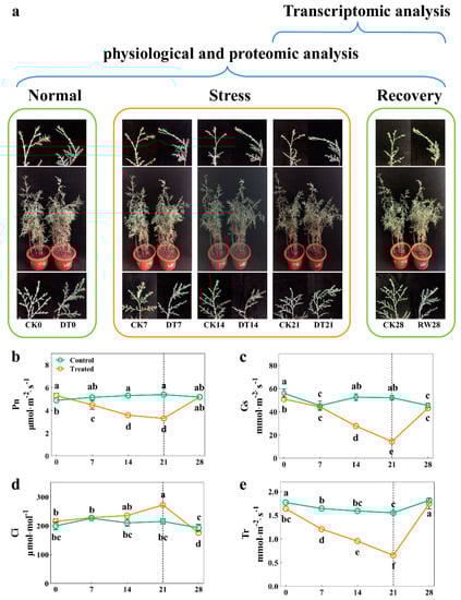 The effect of drought stress on the morphological and photosynthesis traits of C. gigantea. (a) Photographs showing the phenotypes of the seedlings over time. (b–e) Line charts showing the physiological changes corresponding to Pn, Gs, Tr, Ci, respectively. Values are the means ± SD (n = 5). Columns headed by different letters denote means differing significantly from one another (p < 0.05).