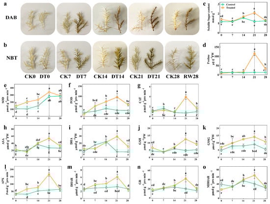 The effect of drought stress on the physiological indexes of C. gigantea. (a,b) Photographs showing DAB and NBT histochemical staining of the seedlings over time. (c–o) Line charts showing the physiological changes corresponding to soluble sugar, proline, superoxide dismutase (SOD), peroxidase (POD), catalase (CAT), ascorbic acid (ASA), dehydroascorbic acid (DHA), reduced glutathione (GSH), oxidized glutathione (GSSG), ascorbate peroxidase (APX), dehydroascorbate reductase (DHAR), glutathione reductase (GR) and monodehydroascorbate reductase (MDHAR), respectively. Values are the means ± SD (n = 3). Columns headed by different letters denote means differing significantly from one another (p < 0.05).