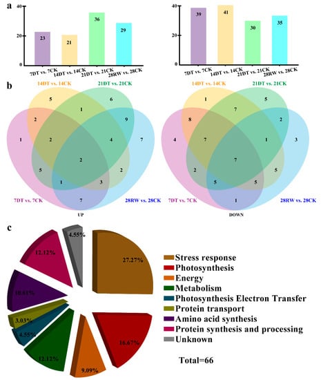 In total, 66 DEPs were identified in the control vs. treatment comparison: 61 (i.e., 23 upregulated and 39 downregulated) in the 7DT vs. 7CK comparison, 62 (21 upregulated and 41 downregulated) in the 14DT vs. 14CK comparison, 66 (36 upregulated and 30 downregulated) in the 21DT vs. 21CK comparison and 64 (29 upregulated and 35 downregulated) in the 28RW vs. 28CK comparison (Figure 3a,b). In addition, there were four proteins (Spots 6, 10, 11 and 17) whose expression was significantly upregulated by drought, but was upregulated/unchanged during the recovery period. Conversely, the expression of two proteins (Spots 36 and 39) was upregulated/unchanged by drought yet downregulated during the recovery phase of the seedlings (Figure S2).