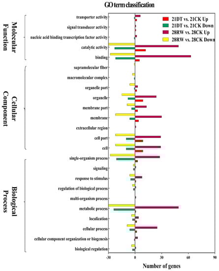 Many DEGs were identified via two pairwise comparisons between the treatment and control (i.e., 21DT vs. 21CK, and 28RW vs. 28CK). Under severe stress, 215 genes were expressed differentially in 21DT vs. 21CK, including 36 upregulated genes and 84 downregulated genes, while 442 genes were expressed differentially under re-watering in 28R vs. 28CK, including 250 upregulated and 97 downregulated genes (p < 0.05, fold-change ≥ 2). Another 30 upregulated and 65 downregulated genes overlapped in the pairwise comparisons between 21DT and 21CK, and between 28RW and 28CK (Table S3, Figure S3b).
