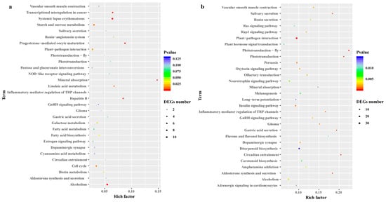 Differentially expressed genes (DEGs) identified by Kyoto Encyclopedia of Genes and Genomes (KEGG) pathway analysis in C. gigantea. (a) Top 30 KEGG enrichment results in 21DT vs. 21CK. (b) Top 30 KEGG enrichment results in 28RW vs. 28CK.