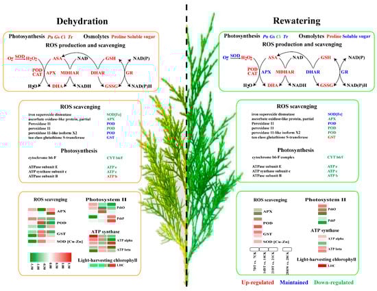 When a reduction in water evaporation is insufficient to mitigate the stress stimulus, plants mainly respond to dehydration by activating a defense system of enzymatic and non-enzymatic antioxidants to cope with the overaccumulation of reactive oxygen species (ROS) [10]. Superoxide dismutase (SOD) is the first line of plant ROS defense, catalyzing the conversion of oxygen ions (O2·−) to oxygen (O2) and hydrogen peroxide (H2O2), which is then eliminated by the coordinated action of peroxidase (POD), catalase (CAT), ascorbate peroxidase (APX) and the AsA-GSH cycle [11]. Additionally, some enzymes, including APX, glutathione reductase (GR), dehydroascorbate reductase (DHAR) and monodehydroascorbate reductase (MDHAR), maintain the balance of AsA-GSH [12]. In addition, numerous drought-related transcripts and proteins are induced, which involve signaling transduction, activation/regulation of transcription, antioxidant capacity and ROS scavengers [13]. Thus, joint transcriptomic and proteomic profiling is considered to be effective and acceptable for disentangling the sophisticated processes of plants’ responses to water deficit at the molecular levels [14,15].