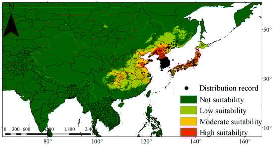 Species distribution models have been widely used to study the effects of climate change on the potential geographic species distribution based on maximum temperature, minimum temperature, relative humidity, rainfall and other environmental factors [14,15,16,17,18,19]. The MaxEnt model can simulate the potential geographic distribution of species based on environmental variable layers, species distribution records, machine learning and the maximum entropy principle. The MaxEnt model is suitable where the number of species distribution points is uncertain and the correlation between environmental variables is unclear [20,21]. Therefore, it is very suitable for modeling species distribution [22,23,24]. Moreover, MaxEnt is suitable when compared with other current approaches because it works with “presence data only” and cannot detect and collect ‘absence data’, which are rarely available [18,25]. The MaxEnt model has a continuous output (a maximum likelihood estimate of the relative probability of presence) instead of a deterministic role [26]. The MaxEnt model is widely used to study the relationship between species distribution dynamics and climate change [27]. It is also used to predict the sanctuary of organisms during the ice age [28,29].