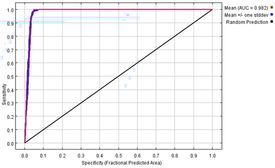 Models are usually evaluated using overall accuracy, sensitivity, specificity, kappa and true skill statistic indicators [42,43]. The threshold cannot affect the ROC curve. As a result, the ROC curve is presently considered one of the best evaluation indicators. MaxEnt software can directly draw the ROC curve and calculate the AUC value of the model and is, thus, convenient for judging the predictive effect of the model. Therefore, ROC curves are widely used in the evaluation of MaxEnt models. The stability of a model is usually verified using 10 repeated AUC values. Herein, the average AUC value of the 10 repeated runs of the model was 0.982, indicating that the simulation effect was ‘excellent’, and, thus, the model can be used to simulate the potential distribution of P. densiflora in East Asia [44].