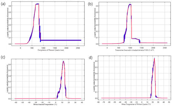 Response curves of the major climate factors. (a) Precipitation of the Warmest Quarter (mm), (b) Temperature Seasonality (standard deviation ×100) (C of V), (c) Mean Annual Temperature (°C), (d) Mean Temperature of the Wettest Quarter (°C).