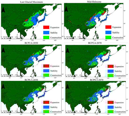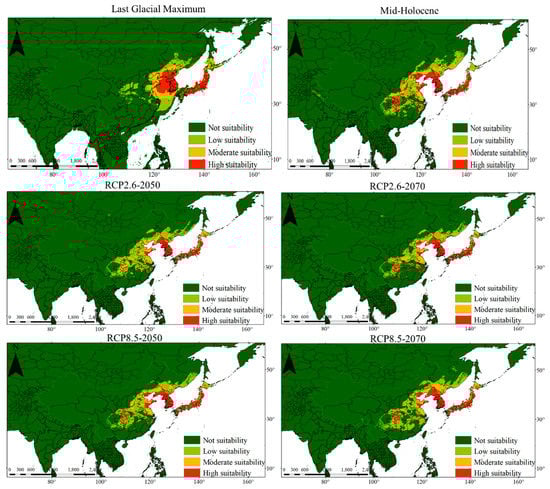 In the LGM, mid-Holocene, current situation and future scenarios, the suitable area shows a single-peak trend, and the current area is the peak (Figure 1 and Figure 5, Table 3). The total suitable areas of the LGM and the mid-Holocene decreased by 25.76% and 11.65%, respectively. However, the high-suitability area increased by 47.56% and 32.35%, respectively. During the LGM and the mid-Holocene, the medium-suitability area decreased by 20.46% and 20.12%, respectively, and the low-suitability area decreased by 44.67% and 26.40%, respectively. Under the RCP 2.6 scenario, the total suitable area in 2050 will be about 2.52 × 106 km2, 30.19% less than the current distribution area. The high-suitability area will decrease by 4.13%, the medium-suitability area will decrease by 22.10% and the low-suitability area will decrease by 38.90%. The total suitable area in 2070 will be about 2.31 × 106 km2, 36.18% less than the current distribution area. The high-suitability area will increase by 12.18%, the medium-suitability area will decrease by 33.24% and the low suitability area will decrease by 48.48%. Under the scenario of RCP 8.5, the total suitable area in 2050 will be about 2.43 × 106 km2, 32.73% less than the current distribution area. The high-suitability area will increase by 1.50%, the medium-suitability area will decrease by 21.46% and the low-suitability area will decrease by 43.67%. In 2070, the total suitable area will be about 2.30 × 106 km2, 36.61% less than the current distribution area. The high-suitability area will decrease by 2.53%, the medium-suitability area will decrease by 38.41% and the low-suitability area will decrease by 45.21% (Table 3, Figure 5).
