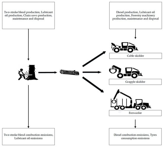 A lack of insight still pertains to the environmental impacts of harvesting alternatives. Indeed, the impact of forestry mechanised processes on the environment should be validated, considering all implemented inputs and outputs related to the involved technology. Today, one of the most powerful and effective tools useful for assessing the environmental sustainability of a process or product is undoubtedly the Life Cycle Assessment (LCA). Although LCA can be very onerous in terms of amounts and quality of data needed to be gathered, this metric, widely recognised and validated from international standards [26,27], allows conducting of the expansion of the analysis boundaries to the whole life cycle of a product or a process in a so-called cradle-to-grave approach. However, according to Duka et al. [28], the LCA implementations in forestry are not yet widely spread, probably due to the complexity of concerns linked to the production process and the “dynamic nature of forests and long-term production period, corresponding to the rotation period”.