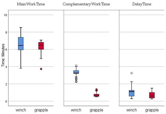 Figure 5. Time consumption of work element for scenario (iii). The boxes include the variability of the data between the 25th and the 75th percentiles. The horizontal black line represents the median. Whiskers are the largest and smallest values that are not outliers.