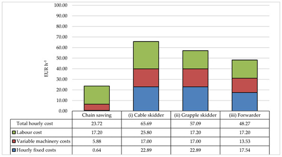 The economic assessment was carried out by comparing the harvesting costs of different harvesting systems. The method described by Miyata [42] was applied to determine the machine hourly cost (Table 2), and thus, through the hourly yields of the individual mechanical operations, it was possible to determine the cost per m3 of wood harvested in each harvesting system. Both the fixed and variable costs were considered, whereas the fixed costs consisted of the interest on capital goods, depreciation, insurance and maintenance of the machinery, while equipment and variable costs consisted of the fuel and oil consumption and operator–machine labour.