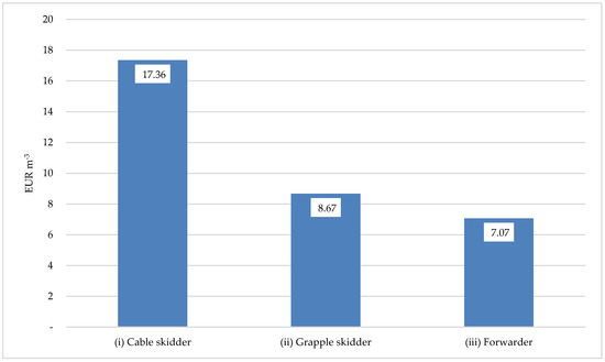 Analysing the three different wood harvesting systems as a whole through the analysis of the cost of “1 m3 of harvested wood” (Figure 7) results in even greater differences observed. Scenario (i) presents an overall cost of EUR 17,356.00 m−3, making it the most expensive, followed by scenario (ii); scenario (iii) is the most convenient, with a cost of EUR 7071.00 m−3.