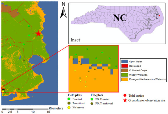 The study area (35.558–35.863° N, 75.693–75.859° W, excluding Open Water) with land cover types as determined by 2016 National Land Cover Database (NLCD). Inset: the location of the study area in North Carolina (NC). The black box in the inset indicates the study area. The red dot in the inset indicates the location of the NOAA tidal station (Oregon Inlet Marina, NC). The red star indicates the groundwater observation site (35.768° N, 75.750° W). The pentagon represents field plots in the Forest Inventory and Analysis (FIA) data set. The zoom-in figure in the red box shows the detailed spatial distribution of field plots obtained from Smart et al. [19], Poulter [48], and Taillie et al. [49].