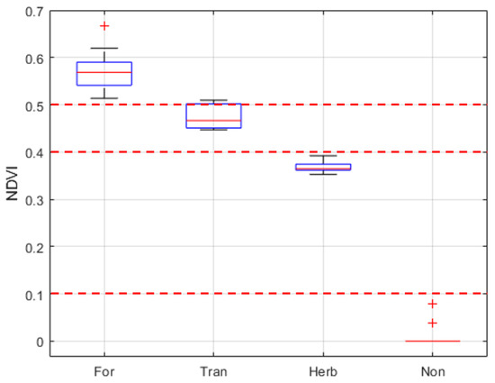 Box plots of NDVI for forested wetlands (For), transitional forested wetlands (Tran), emergent herbaceous wetlands (Herb), and non-vegetated areas (Non), respectively. Red horizontal dash lines represent thresholds (0.5, 0.4, 0.1) between different wetland types. The red solid horizontal line, box, and whisker ends indicate the median, 25th and 75th percentiles, and the 10th and 90th percentiles, respectively. The data points outside the ranges are shown by the red plus (+) sign.