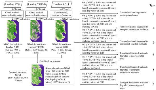 Besides, multiple surface reflectance imageries from Landsat 5 TM, 7 ETM+, and 8 OLI were used in the study. The sensors carried by Landsat 5 TM and Landsat 7 ETM+ have almost the same spectral bands, while the sensor of Landsat 8 OLI has narrower bands. According to Ke et al. [85], Roy et al. [86], and Xu and Guo [87], NDVI calculated from Landsat 8 OLI images is slightly larger than that calculated from Landsat 5 TM/7 ETM+ images in lower-vegetation covered areas. As for our study, the slight difference of NDVI between Landsat 8 OLI and Landsat 5 TM/7 ETM+ can be negligible since it is considered that wetland degradation occurred when NDVI values were continuously below the NDVI threshold of the relatively higher structurally complex wetland type for eight consecutive seasons.