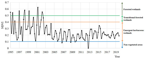 Previous analysis demonstrated that different vegetation types often have different NDVI values [60,61,62]. Therefore, NDVI ranges of wetland vegetation types from all available peer-reviewed literature were employed to establish the connections between NDVI and vegetation types. Specifically, non-vegetated areas have very low values of NDVI (i.e., 0.1 and below) [63,64], grasslands correspond to moderate values (i.e., 0.2 to 0.3) [65,66], while high NDVI values indicate rainforests (i.e., 0.6 and above) [67,68,69,70,71,72].