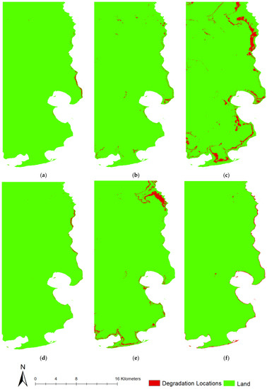 Detected wetland degradation mainly occurred within 2 km of the shoreline (Figure 6). At the same time, Type 3 (forested wetlands to transitional forested wetlands) and Type 5 (transitional forested wetlands to emergent herbaceous wetlands) degradations were also found in the interior part of the landscape or along the developed road (Figure 6c) and at the flooding plain northeast of the study area (Figure 6e), respectively. Figure 6 also indicates a gradient of the wetland degradation from the shoreline to the inland. Therefore, it is not surprising that the detected degradation was in the order of emergent herbaceous wetlands (Figure 6f), transitional forested wetlands (Figure 6d,e), and forested wetlands from the sea toward land (Figure 6a–c) given that emergent herbaceous wetlands and woody wetlands were initially distributed along with shoreline areas and inland, separately (Figure 1).