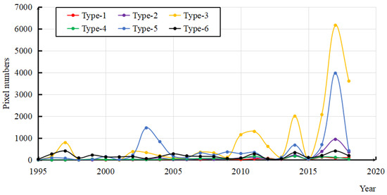 We also determined the time when the identified wetland degradation occurred using this framework. Figure 7 summarizes the total number of wetland pixels experiencing degradation over the ARNWR in each year. Most wetland degradation occurred within the past five years; 2014 and 2017 witnessed the most significant percentage of coastal wetland degradation.