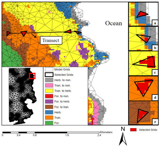 The selected transect and representative model triangular grids. (a) Emergent herbaceous wetlands degrading to non-vegetated areas (Type 6 degradation); (b) Emergent herbaceous wetlands without degradation; (c) Transitional forested wetlands degrading to emergent herbaceous wetlands (Type 5 degradation); (d) Transitional forested wetlands without degradation; (e) Forested wetlands degrading to transitional forested wetlands (Type 3 degradation). (For.: Forested wetlands; Tran.: Transitional forested wetlands; Herb.: Emergent herbaceous wetlands; Non.: Non-vegetated areas).