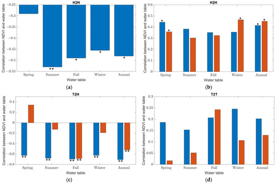 Correlations of grid-wise mean annual maximum NDVI to seasonal/annual mean saltwater tables (SWTs) and groundwater tables (GWTs) for different types of wetland evolution. (a) H2N: Emergent herbaceous wetlands degrading to non-vegetated areas (Type 6 degradation). Due to the fact that this triangular irregular grid was next to the sea (Figure 8a), and the simulated SWT was above the land surface, there was no distinction between saltwater and ground freshwater. Therefore, only the grid-wise mean annual maximum NDVI time series with seasonal/annual mean SWTs were presented; (b) H2H: Emergent herbaceous wetlands without degradation; (c) T2H: Transitional forested wetlands degrading to emergent herbaceous wetlands (Type 5 degradation); (d) T2T: Transitional forested wetlands without degradation; (e) F2T: Forested wetlands degrading to transitional forested wetlands (Type 3 degradation). p < 0.05 is denoted with a single star (*); p < 0.01 is denoted with double stars (**).