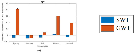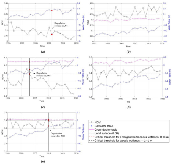 Figure 10 also provided insight into the opposite correlations between water tables and NDVI for degraded wetlands (Figure 9a,c,e) and non-degraded wetlands (Figure 9b,d). For the non-degraded emergent herbaceous wetlands (Figure 10b), during the 25 years, although the SWT had risen from −0.30 m in 1995 to −0.12 m in 2019 (Figure 10b), it still below the critical value (0.16 m). Meanwhile, rising GWTs allowed the plants to quickly draw fresh water from the soil, conducive to vegetation growth and increasing NDVI values [93]. Thus, positive correlations exist between water tables (GWTs and SWTs) and NDVI values in non-degraded wetlands (Figure 9b). On the contrary, for the degraded emergent herbaceous wetland (Figure 10a), the water table rose above the critical threshold (0.16 m), leading to the decline of vegetation (i.e., decreases of NDVI values). As a result, negative correlations between water tables and NDVI values can be found in the degraded wetlands (Figure 9a). Similar phenomena are observed in degraded (Figure 9c,e and Figure 10c,e) and non-degraded woody wetlands (Figure 9d and Figure 10d).