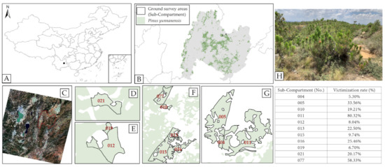 Diagram of the study area. (A) Shilin in China; (B) Pinus yunnanensis forests in Shilin; (C) Landsat image with the study area; (D–G) Ground survey areas; (H) Yunnan pine forest (partial). Victimization rate = (The number of infested trees/Total number of trees) × 100%.
