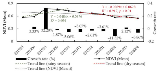 The slope of inter-monthly NDVI variation was calculated for the rainy, dry, and whole year, respectively.