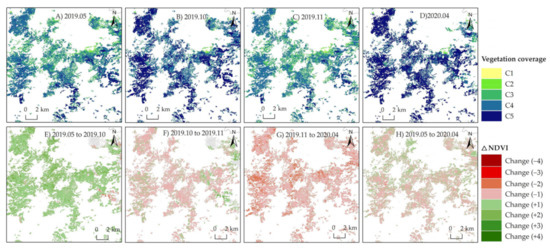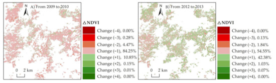 The ΔNDVI represents the difference in NDVI at different times in the same area, and it’s classification thresholds are assigned according to the NDVI coverage classes (Table 2) [1,27,28].