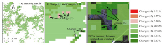 NDVI changes from May to August 2019. (A) ΔNDVI for May versus August 2019. (B) Location of Change (+3) and Change (−1). (C) The interface between agricultural land and woodland.