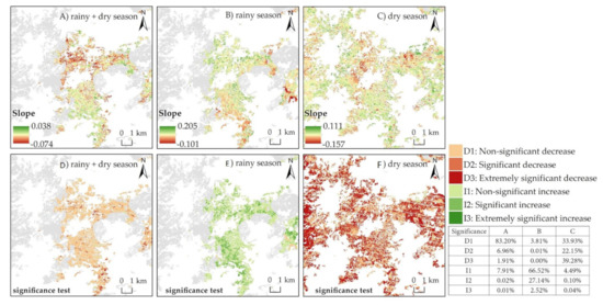 Slope and significance test results for rainy+dry season, rainy season, and dry season.