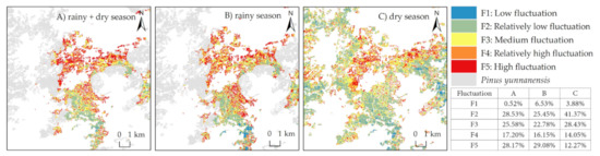 Figure 6 shows the spatial distribution of inter-monthly CV of NDVI in Yunnan pine forests during the rainy + dry, rainy, and dry seasons. It could be observed that 70.92% of Yunnan pine forests had CV values less than 0.2 in the rainy season, 87.73% in the dry season, and 71.83% in the rainy + dry season. This means that the coverage of Yunnan pine forests is stable, either during the rainy season, the dry season, or throughout the rainy + dry season. Analyzing the NDVI fluctuations in Yunnan pine forests in three situations, we found that the fluctuations were more dramatic in most forest areas located at the edges and a few in the central part of the forest.