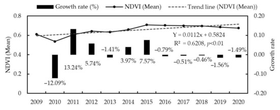 The maximum NDVI rasters synthesized for November of each year in the study area from 2009 to 2020 were classified, and their mean values were calculated, as shown in Figure 7. The NDVI values fluctuated within the range of 0.54–0.79 from 2009 to 2020, showing two increases and three decreases, with an overall increasing trend (p < 0.01).
