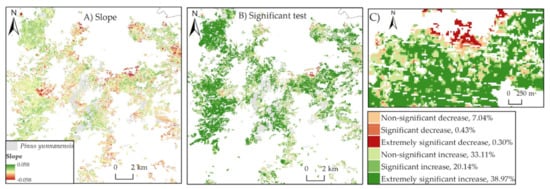 The slope of NDVI change in Yunnan pine stands during the rainy season ranged from −0.101 to 0.205, with a mean value of 0.050 (Figure 5B). A total of 96.18% of the stands showed an increase in NDVI, of which 2.52%, 27.14%, and 66.52% were extremely significant, significant, and non-significant increases, respectively. On the other hand, 3.82% of the stands showed a decrease in NDVI, of which 0.00%, 0.01%, and 3.81% were extremely significant, significant, and non-significant decreases, respectively.