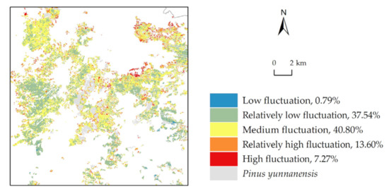 Figure 11 shows the spatial distribution of CVNDVI in Yunnan pine forests from 2009 to 2020, with CVNDVI calculated according to Equation (2). It can be found that 92.73% of Yunnan pine forests had CVNDVI values less than 0.2, which means that the vegetation cover of Yunnan pine forests was overwhelmingly stable during these 12 years. In contrast, 7.27% of the pine forests showed high fluctuations in NDVI, and these areas were mainly located at the boundaries of Yunnan pine forests, while very few of them were located in the center of the forest area.