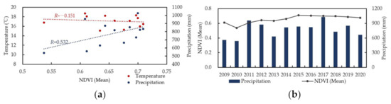 NDVI versus temperature and precipitation for 2009 to 2020. (a) Correlation of NDVI with temperature and precipitation; (b) Precipitation vs. NDVI.