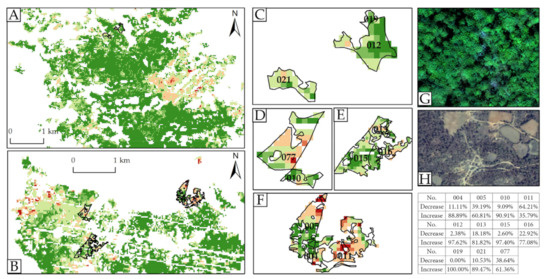 Slope significance test results for NDVI of pine forests in Heilongtan Reservoir and Xijiekou Town (2009–2020). (A) Forest area of Heilongtan Reservoir; (B) Forest area of Xijiekou Town; (C) Ground survey area of Heilongtan Reservoir forest; (D–F) Ground survey area of Xijiekou Town forest; (G) The image of Heilongtan Reservoir forest; (H) The image of Xijiekou Town forest.
