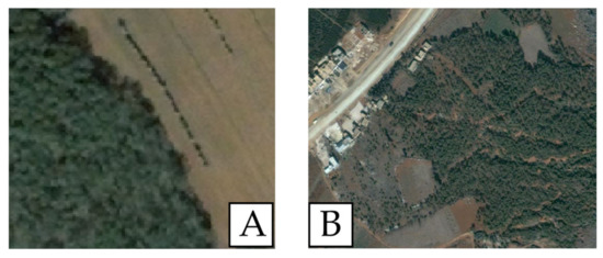 Diagram of forest areas bordering agricultural land and buildings. (A) Forest areas bordering agricultural land; (B) Forest areas bordering buildings.