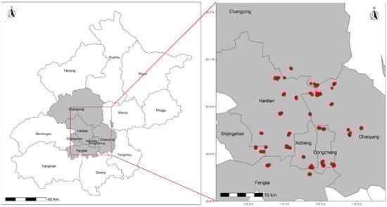 Locations of the sample plots in Beijing, China: regions of study shown in grey, magnification to show the sampling sites as red dots.