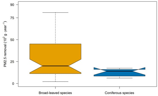 The PM2.5 retention capacities of different tree species were found to be significantly different. Among the tree species with a sample size of ≥3, the annual PM2.5 retention was the highest for Populus tomentosa (12,234.06 g per tree) and lowest for Rhus typhina (221.2 g per tree). The average PM2.5 retention was 1790 g per tree. There were a total of 14 tree species with a PM2.5 retention of more than 3000 g per tree. The results of the Wilcoxon rank sum test for 48 broad-leaved tree species and 8 coniferous tree species showed that the tree height, crown base height, and crown diameter (N–S and E–W) of broad-leaved tree species were significantly higher than those of conifers (Table 1), and the PM2.5 retention per tree of broad-leaved tree species was significantly higher than that of coniferous species (p-value: 0.0427) (Figure 2).