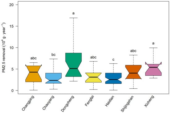 The 176 sample plots were located in 7 administrative districts, including 11 in Changping District, 40 in Chaoyang District, 26 in Dongcheng District, 14 in Fengtai District, 62 in Haidian District, 12 in Shijingshan District, and 11 in Xicheng District. The PM2.5 retention levels of the sample plots in Dongcheng and Xicheng Districts were significantly higher than those in Chaoyang and Haidian Districts (Figure 3).