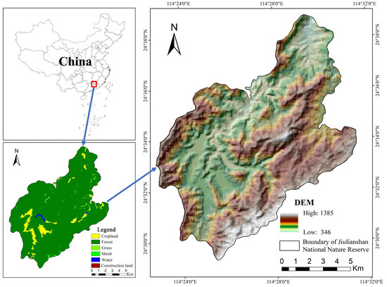 Jiulianshan National Nature Reserve (24°29′18″–24°38′55″ N, 114°22′50″–114°31′32″ E) is located in southern Jiangxi Province, China (Figure 1). The total area of this reserve is 13,411.6 ha, spanning almost 15.7 km north-south and 15 km east-west. The elevation ranged from 280 to 1434 m, and the terrain is low in the north and high in the south. Jiulianshan National Nature Reserve belongs to the East Asian monsoon climate zone, with a warm and humid climate and distinct dry and wet seasons. The average annual precipitation is 2155.6 mm, the average annual temperature is 16.4 °C, and the annual evaporation is 790.2 mm. Jiulianshan National Nature Reserve is highly valuable in biodiversity and has a typical, large-scale and well-preserved subtropical forest ecosystem. The main type of vegetation in this area is the broad-leaved evergreen forest, including Castanopsis carlesii (Hemsl., Hayata.), Schima superba (Gardn. et Champ.), and Litsea elongata (Wall. ex Nees Benth. et Hook. F). Coniferous forests are also widespread, such as Pinus massoniana (Lamb.), Cunninghamia lanceolata (Lamb., Hook)., and Taxus wallichiana var. mairei (Lemee & H. Léveillé, L. K. Fu & Nan Li). Moso bamboo forests are mainly composed of Phyllostachys edulis (Carriere, J. Houzeau) (Supplementary Material Figure S1). In addition to vegetation resources there are abundant animal resources, such as 384 wild vertebrates and 1404 insect species. Moreover, there are 9 rural settlements in reserve, and most of the residents are engaged in agriculture and forestry production.