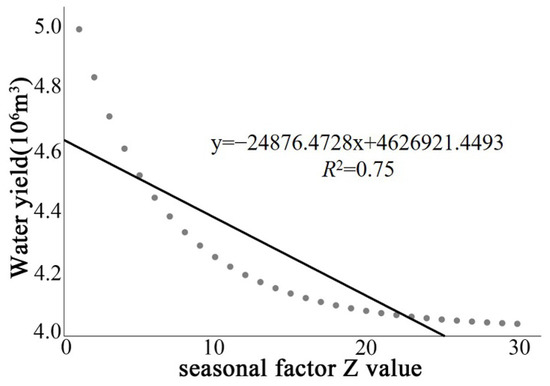 The seasonal parameter Z-value is an empirical constant that indicates the regional precipitation distribution and geohydrological characteristics [45]. Correlation between simulated data and field survey data can ensure the accuracy of the water yield model. In this study, the average runoff volume (4.55 × 106 m3) of the Jiulianshan National Nature Reserve No.4 measuring weir (24°31′45″ N, 114°27′36″ E) in 2010 was used as a reference to calibrate the accuracy of the simulation results. The results of the correlation analysis indicated that the water yield was negatively correlated with the Z-value (R2 = 0.75, p < 0.01), and the fitted equation showed that the simulated water yield matches best with the natural runoff in 2010 when Z = 3.33 (Figure 2).