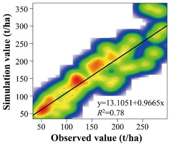We selected 100 forest survey plots (20 m × 20 m) to validate the carbon storage and sequestration model of the InVEST model. At each plot we identified species and measured the diameter at breast height of trees over 1 cm. Three randomly placed sample squares (5 m × 5 m) within each sample plot were used for soil sampling. The results showed that the simulation results were close to the forest survey data and that the correlation coefficient between the two is 0.78, which means a high correlation (R2 = 0.78, p < 0.01, Figure 3).