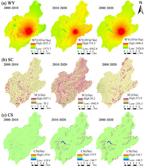 Spatial and temporal variation in ecosystem services in the study area from 2000 to 2010, 2010 to 2020, and 2000 to 2020; (a) water yield; (b) soil conservation; (c) carbon sequestration.