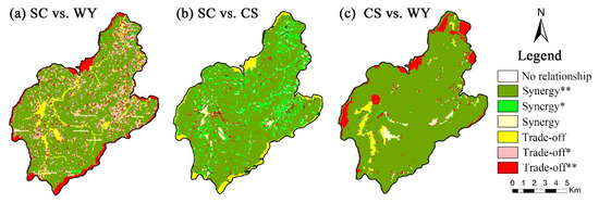We calculated the pixel-scale spatial correlation coefficients to explore the trade-offs and synergies between each ecosystem service (Figure 6). The result showed that synergies were spatially dominated in water yield, soil conservation, and carbon sequestration interactions. The synergies areas accounted for 67.90% of soil conservation and water yield and were spatially aggregated in the central and southern regions. The weak trade-offs were mainly concentrated in the eastern, northern, and western areas, while strong trade-offs were concentrated in the northern, southern, and southwestern marginal regions (Figure 6a). For soil conservation and carbon sequestration, the synergistic relationships were mainly distributed in the study areas’ central, southern, and western parts, which accounted for 90.35%. The trade-off areas were small and dispersed and were spatially aggregated in the northern, southern, and southwestern fringes (Figure 6b). For carbon sequestration and water yield, the synergistic relationships were mainly clumped within the eastern, central, and southern areas, which accounted for 89.14%. The trade-off areas were spatially aggregated in the northern and western regions (Figure 6c).