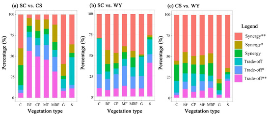 The distribution of trade-offs and synergies among ecosystem services in various vegetation types is shown in Figure 7. Synergistic relationships between soil conservation and carbon sequestration were dominant in cropland, grass, and shrub, and occupied 84.89%, 77.45%, and 51.29%, respectively (Figure 7a). The trade-off relationships were most significantly concentrated in broad-leaved, coniferous, mixed, and Moso bamboo forests. The trade-offs between soil conservation and water yield were mostly concentrated in cropland and shrub, which accounted for 70.25% and 69.24% (Figure 7b). The synergistic relationships were mostly in broad-leaved forests, coniferous forests, mixed forests, and Moso bamboo forests and in grass. For carbon sequestration and water yield, the synergies were significantly concentrated in various vegetation types, which all accounted for more than 50% (Figure 7c).