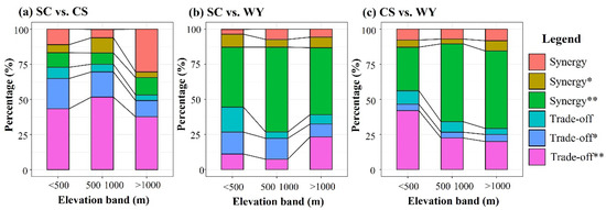 Figure 8 shows the distribution of ecosystem services of trade-off and synergies situations at different elevation bands. For soil conservation and carbon sequestration the trade-offs were concentrated in all elevation bands, and they all accounted for more than 50% (Figure 8a). The trade-offs of areas below 1000 m were significantly stronger than that above 1000 m. Synergies were mostly concentrated in all elevation bands (Figure 8b). Among them, strong synergies were dominant. For soil conservation and water yield the synergistic relationships were concentrated in areas above 500 m, and the trade-offs were mainly in areas below 500 m (Figure 8c). The proportion of trade-offs increased with elevation.