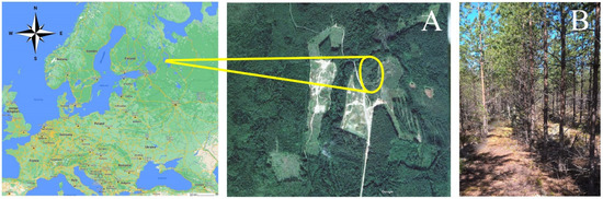 Geographic location of the study sites in the Karelia Republic, Russian Federation (A); 16-year-old Scots pine crops (B).