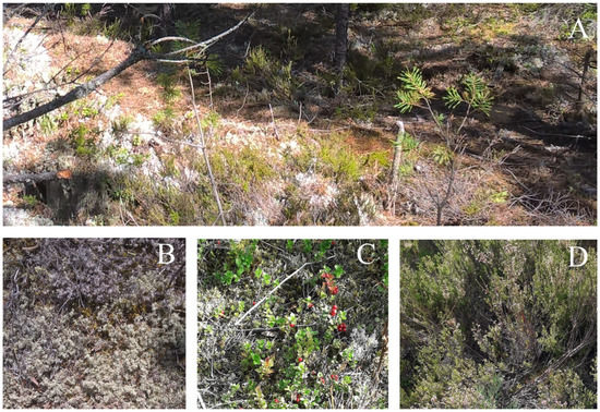 Ground cover of the study area: Overview image (A); Cladonia rangiferina (B); Vaccínium vítis-idaéa (C); Calluna vulgaris (D).