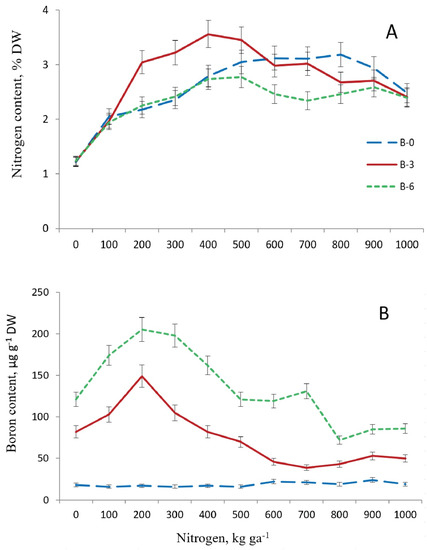 Analysis with two-sample t-test with equal variances was applied to estimate significance of post hoc differences between treatments of different doses of B fertilized at the same level of N (Tukey’s test at a significance level of α = 0.05).